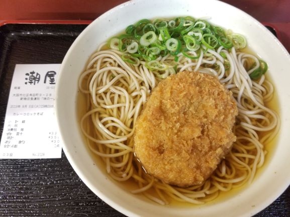 梅田の味の一番街の中にあります。平日昼過ぎに行ったところ、中で食べているのはおじさん2名でしたが、外国の方がお店の前に何名かいらっしゃいました。本か何かに紹介されているんでしょうか。外国の方には立ち食いそばはハードルが高い気がします。コロッケ蕎麦、お蕎麦は生めんで、値段以上の価値ありです。