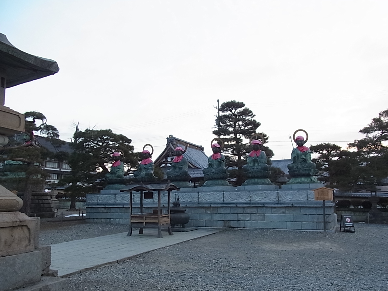 善光寺の三門手前脇にあります。六地蔵の造立年は1759年(宝暦9年)ですが、1942年に戦争の軍事資金・資材収集のために政府に引き渡しされています。現在あるものは、その後、終戦後の1954年(昭和29年)に再び、再興されたものになりますが、六地蔵はひとつひとつに個性があり、座り方や手に持っているものも異なり、見ていて興味深いです、是非。