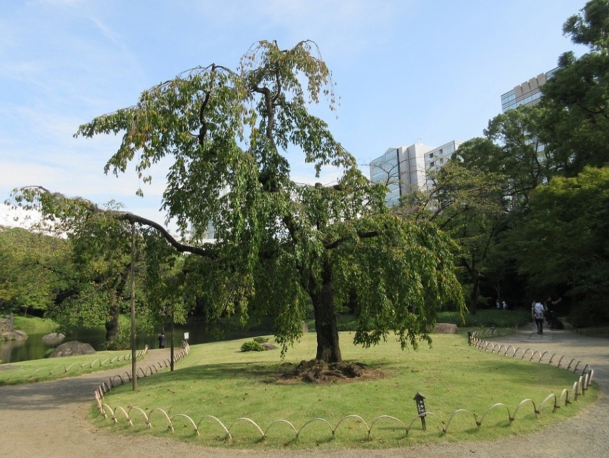 小石川後楽園の入り口からまっすぐ大泉水まですすむと、その手前にお一本の大きな垂桜がありました。大きな木が少ないので、すぐに見つけることが出来ました。ただ、金沢兼六園や長野県飯田にある麻績の枝垂桜に比べると小ぶりに見えました。