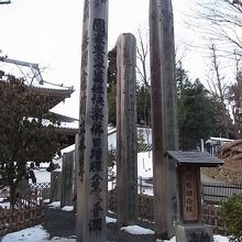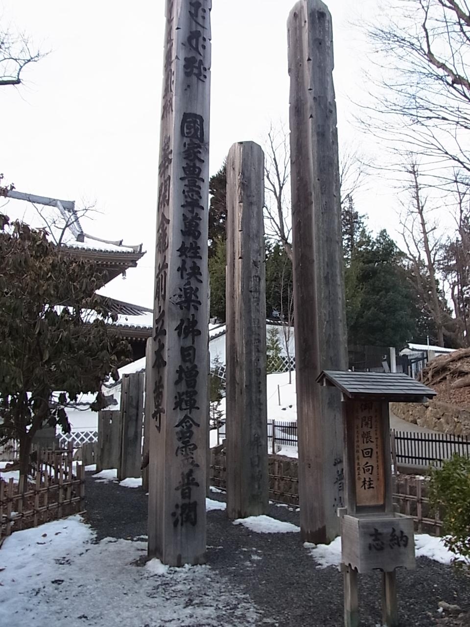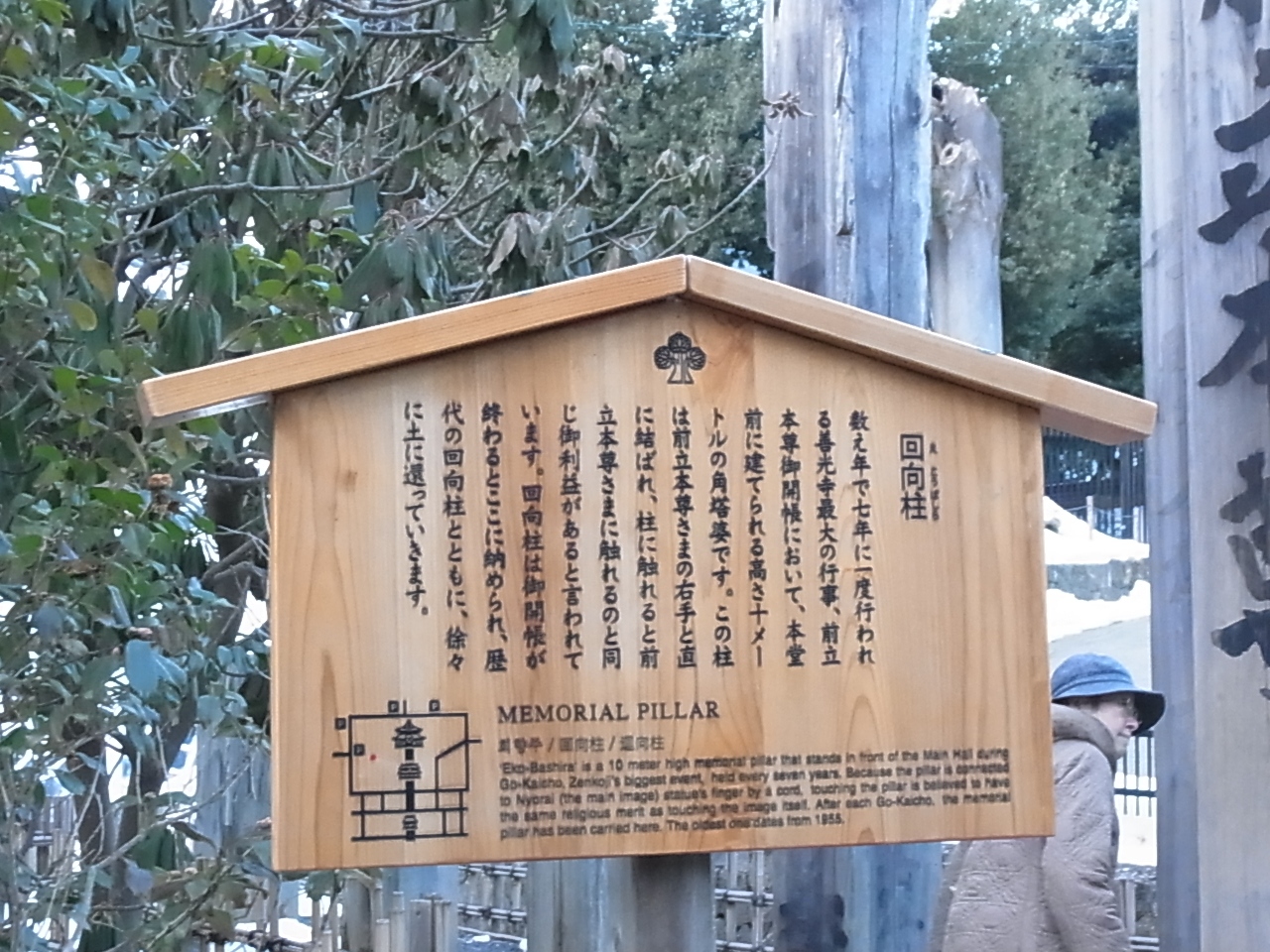 善光寺本堂の左手少し奥にある回向柱です。回向柱とは45㎝角で高さ10メートルの柱で、7年に一度行われる善光寺の前立本尊御開帳のときに建てられる角塔婆のこと。この回向柱に触れると大勧進の安置されている前立本尊に触れたのと同じ御利益があるとされています、是非。