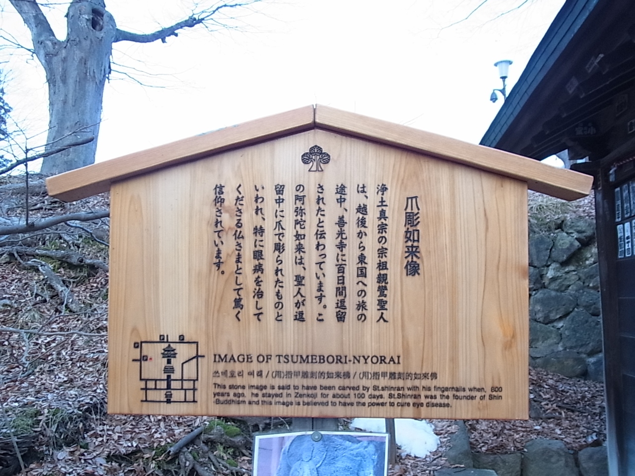 善光寺本堂の左手奥に爪彫如来堂があります。爪彫如来堂の爪彫如来は、浄土真宗開祖でしられる親鸞が、善光寺に百日間逗留した折に、爪で彫ったと伝えられる阿弥陀如来だそうです。主に目の病を治してくれる仏として信仰されてきたそうです。興味のある方は是非。