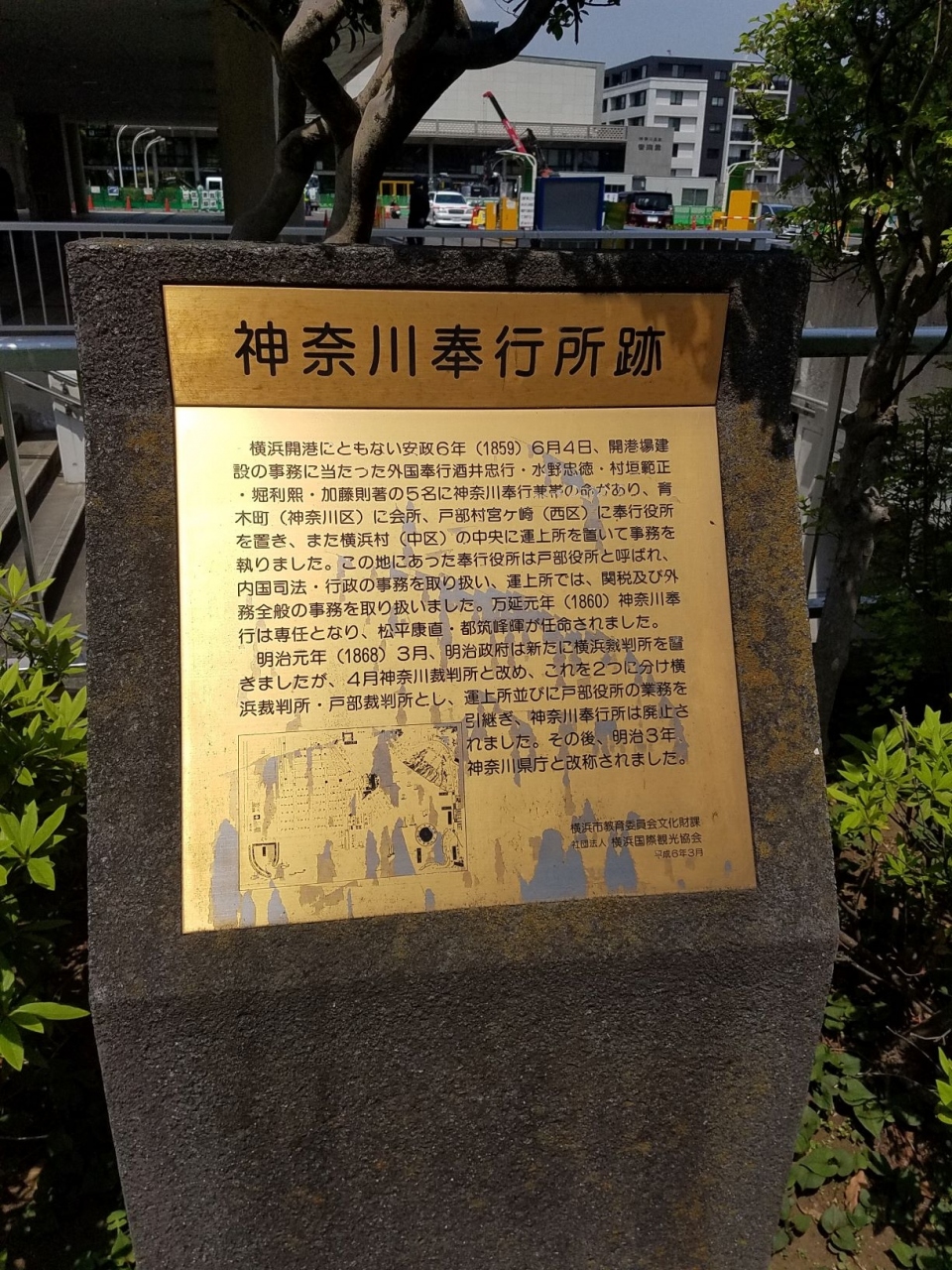 紅葉坂を上った県立青少年センター前にありました。神奈川県庁の敷地の角に神奈川運上所跡がありましたがこちらは奉行所で、行政事務や風俗取締、裁判などを行っていたものです。坂の上で不便そうですが外国人がいる地域から離れていたほうが都合がよかったのだそうです。現在は石碑があるのみですが歴史の側面を一つ知ることができたので訪れてよかったです。