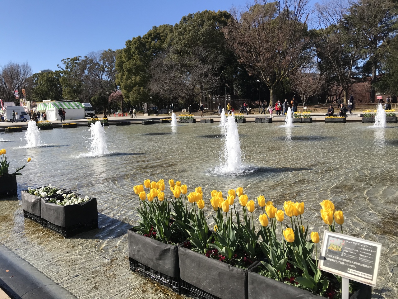 上野観光をしようと思って訪れました。大噴水にあるたくさんのチューリップが満開でとても綺麗です。また小松宮像の近くにある早咲の桜が5分咲きぐらいでしたが可愛らしいピンク色の花が綺麗で癒されます。犬の散歩をしている人、水で絵を描く年配の男性がおり、のんびりとした雰囲気です。