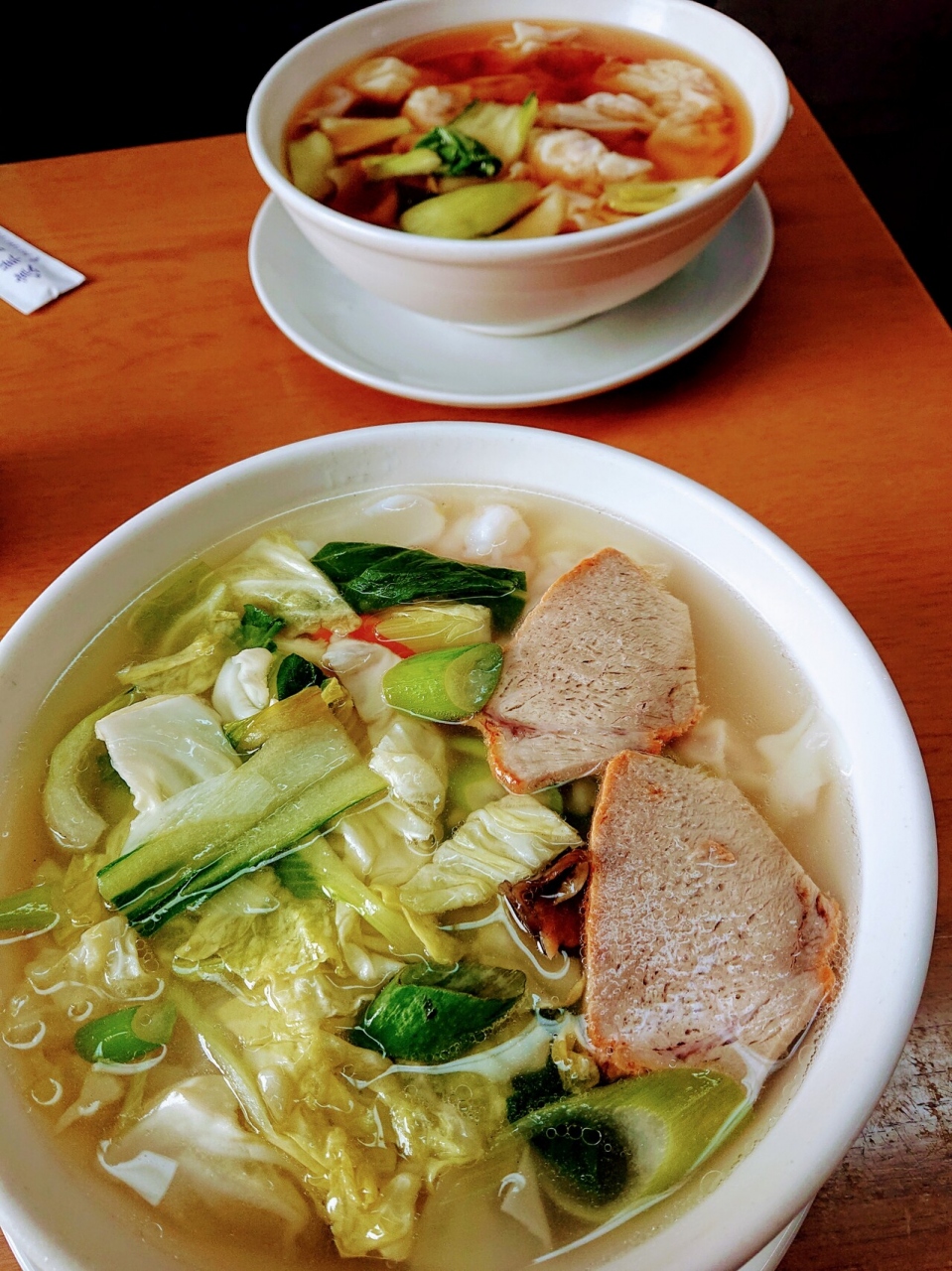 海老ワンタンは醤油味のスープ。五目ワンタンスープは野菜や海鮮、チャーシューが入った塩味。