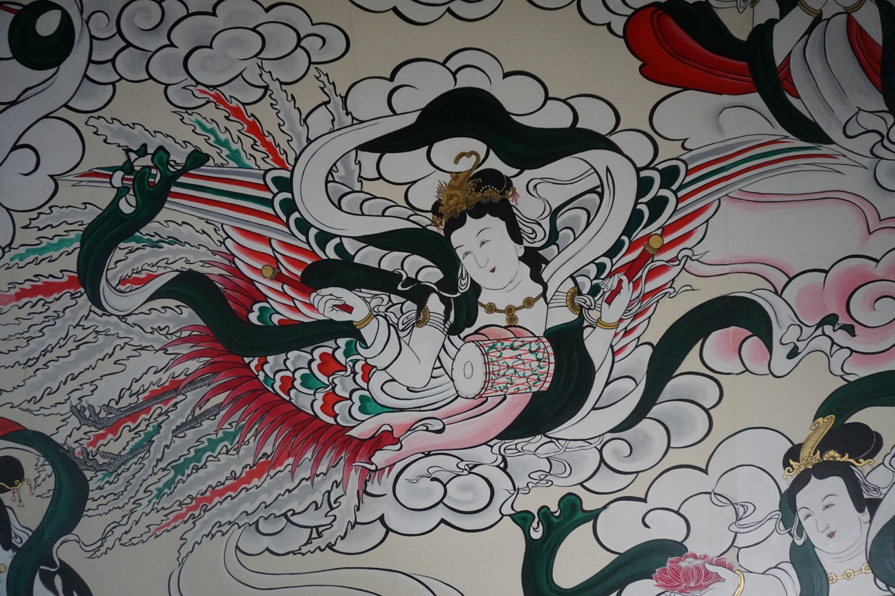 三昧堂は、日蓮が他宗の僧と問答を戦わせたりした場でもあります。お堂は内部拝観ができるのですが、色鮮やかな装飾天井や内陣の天女の絵とか。はっとするくらいの美しさがありました。