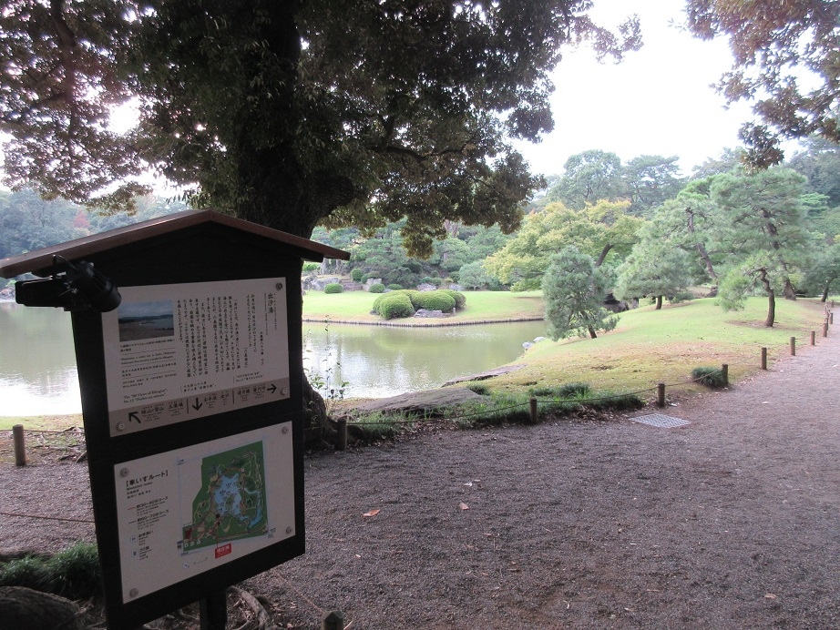 六義園のほぼ中央、大泉水の中の島や木々の鬱蒼と茂る景観を楽しめる場所で、六義園の代表的なスポットです。六義園界隈は高いビルが少ないので、日本庭園の変化に富んだ景観を楽しむことが出来ました。正面入り口からまっすく進んでいくと、正面やや右手のエリアが出汐湊です。