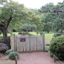 六義園の中で、大泉水の中に浮かぶ妹山・背山がある中の島に渡る橋で、若干盛り上がった形状をしていました。通行止めで、橋の手前に柵が設置されていました。橋は草がうっそうと生い茂り、その奥には木々の生い茂る中の島が見えていました。