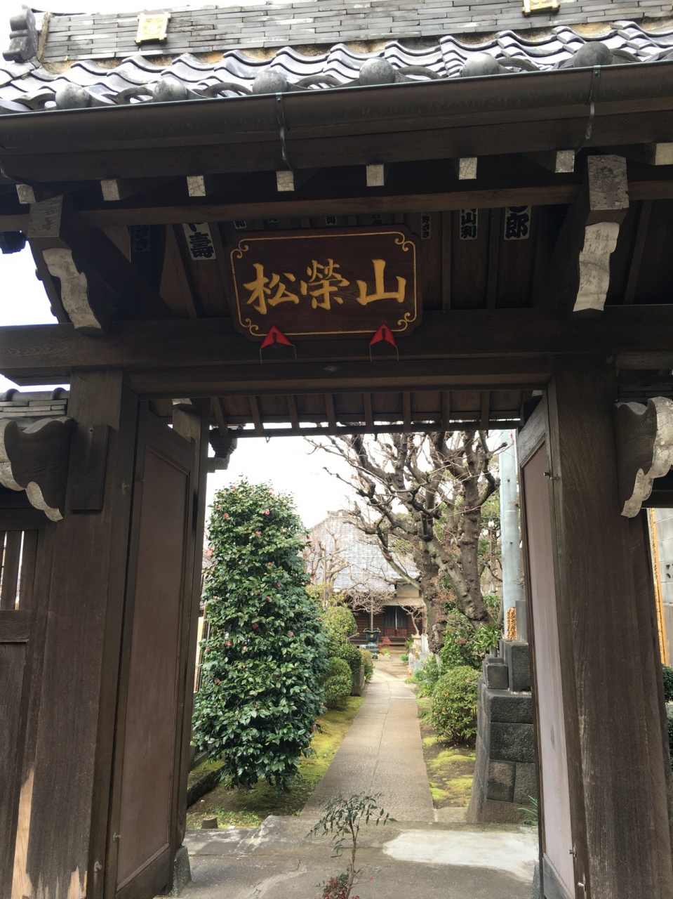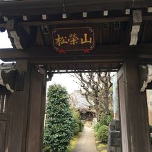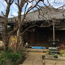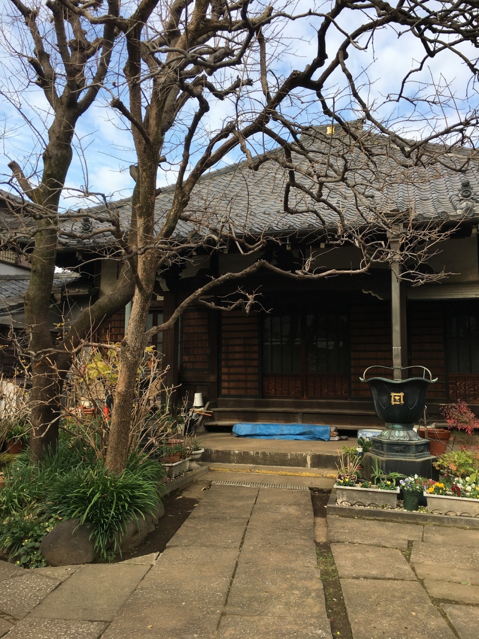 長方形の石畳の地面では左右はコンクリートので短い壁を越えると山門があります。本堂までの参道は短く左右には草木が植わっていました。古い本堂で、花を植えた鉢もありましたが、大きな木があり枝に葉がなかったため、寂しさを感じる寺でした。