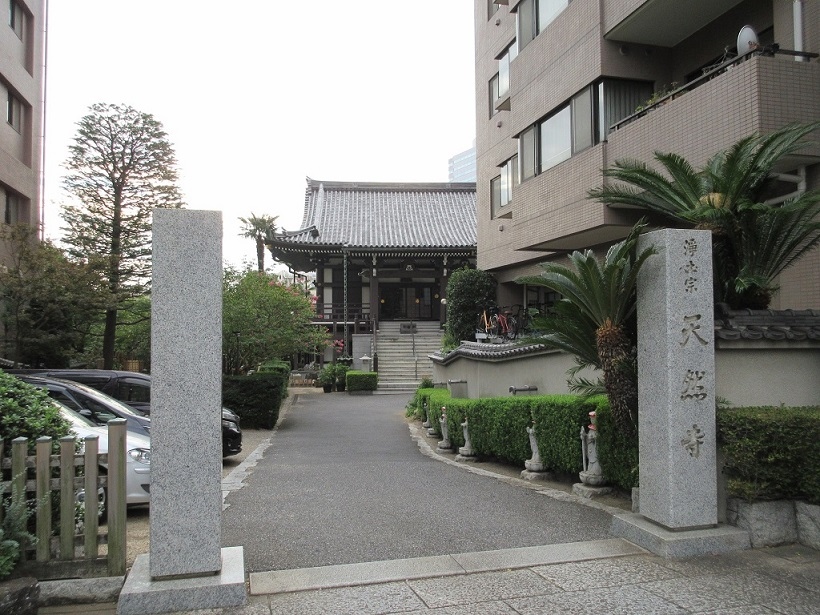 本駒込界隈を本郷通沿いに散策した際に、こちらの浄土宗【天然寺】に立ち寄りました。入り口から続く参道の緑の植え込みには、お地蔵さんが随所におかれていて、入り口の蘇鉄とともに特徴的な景観を形作っていました。本堂は境内の地面より一段高くなっており、階段をあがってアクセスするかたちになります。