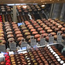 ショーケースには宝石のように輝くチョコがズラリ、美しいケーキも並びます。