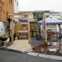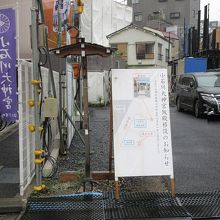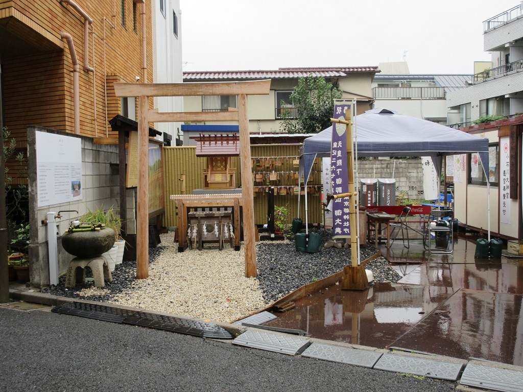 春日通沿いを散策した際に、紫色の幟旗が立っていました。これまで建っていた場所から、私が訪問する少し前に中央大学理工学部向かいの入り組んだ路地の裏に移転したようで、案内看板がたっていました。移転先には、小さな社殿があり、何か神事が行われた直後のようにパイプ椅子などが置かれていました。