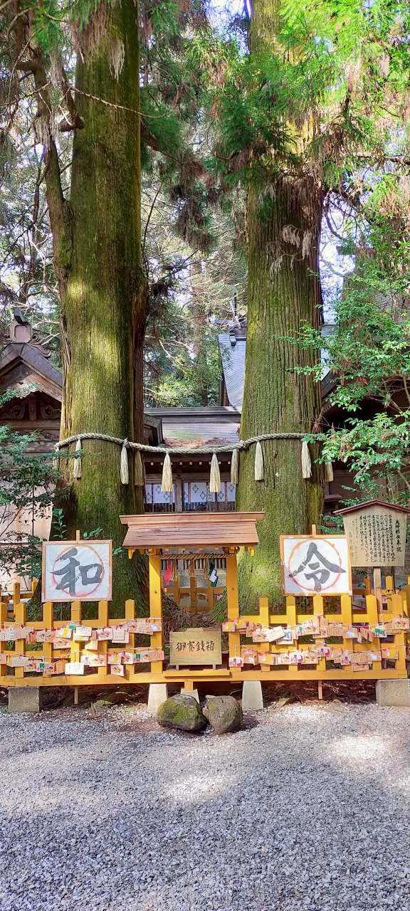 この木はご神木ではないのですが夫婦杉と呼ばれ、夫婦円満・家内安全・子孫繁栄の願いが叶うといわれています。ご利益を受けるには、夫婦や恋人、友達と手をつなぎ、周囲を3周時計回りに回ること。