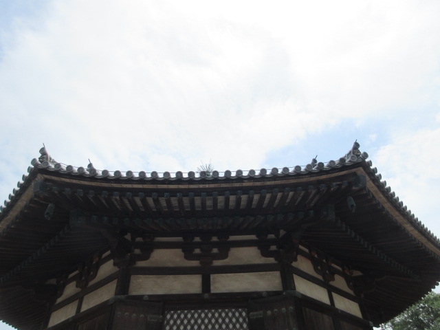 奈良の斑鳩の法隆寺の東院に行きました。その東院のメインともいえる建物がこの「夢殿」です。八角の丸いっぽい建物ですので、ちょっと珍しい雰囲気です。救世観音を本像としていますが、この観音様のモデルは聖徳太子とのこと。中には入れないけど、外からのぞけるようになっていました。