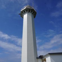 草原の中に建つ白い灯台は、高さ24.2m。細くてすらりとした姿です。昭和3年に点灯。現在のものは昭和62年築の2代目です。