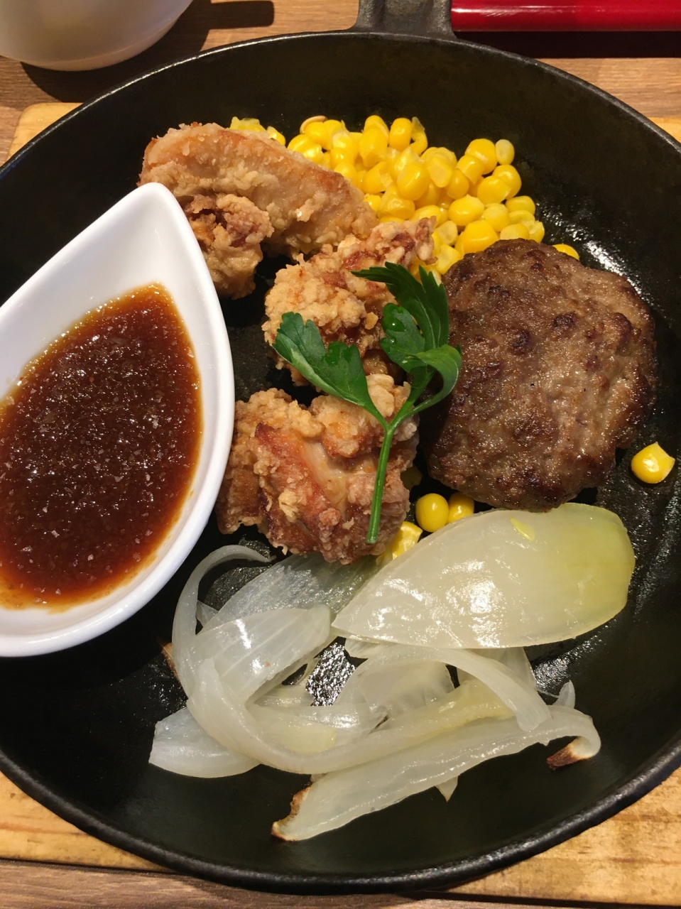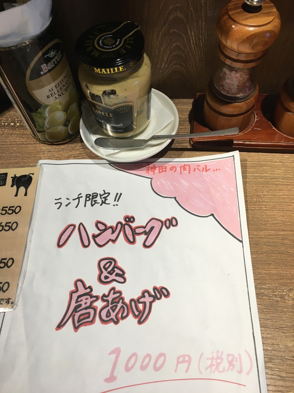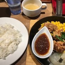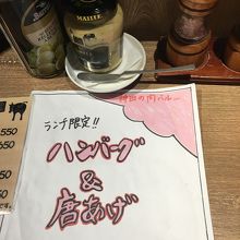 ランチ限定のハンバーグ&唐揚げを注文。サラダ、スープ付きでご飯おかわりが出来ます。ハンバーグは小さなサイズでしたが専門店らしく旨かったです。唐揚げは普通でした。カウンター席の前が調理場で、肉を捌いているのが見えました。