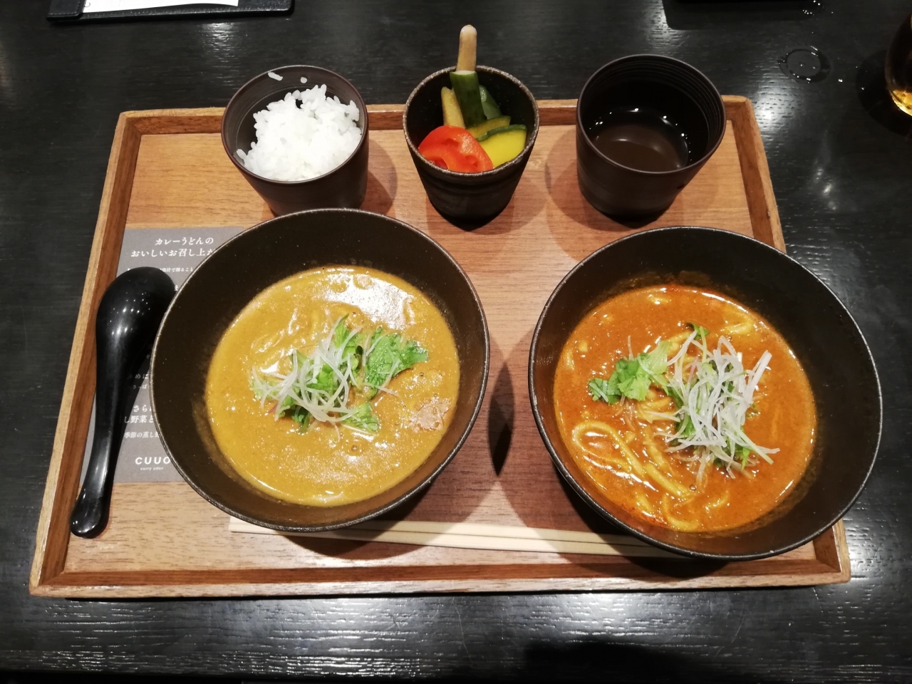 カレーうどんととまとカレーうどんのハーフアンドハーフがおすすめです。