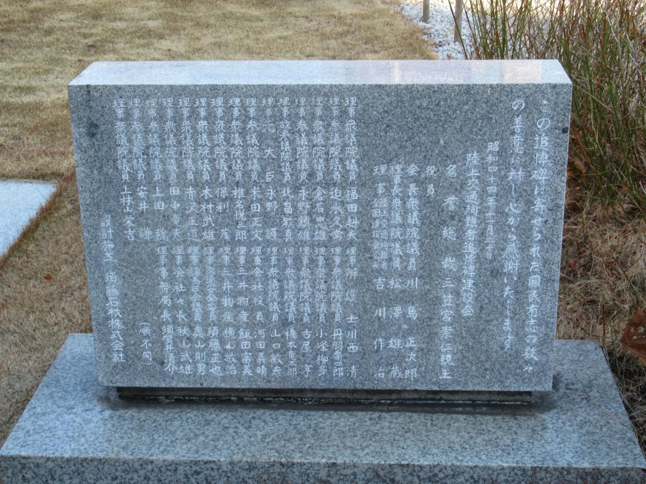 昭和44年に、陸上交通殉難者追悼碑建設会の名誉会長 三笠宮崇仁親王 と役員の方々が、この追悼碑に寄せられた國民有志の数々の善意に対しての心からの感謝の意を表している。