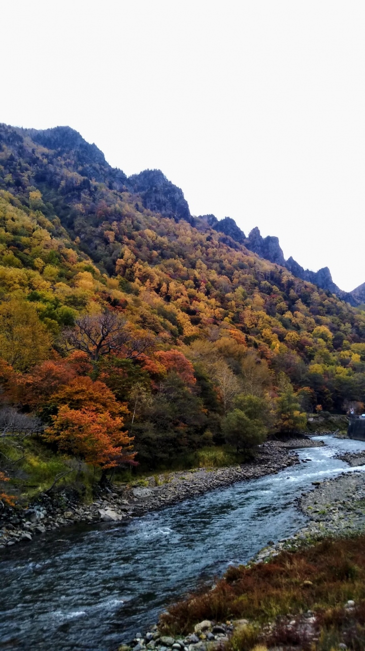 ビジターセンターは、バス停にあります。層雲峡の駐車場からは、ロープウェー乗り場へ登らず川沿いに少し行ったところにあります。ビジターセンターの周囲も紅葉がきれいでした。柱状節理と紅葉の組み合わせがいいですね。