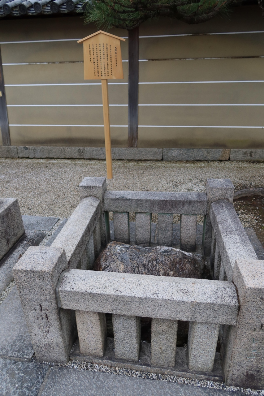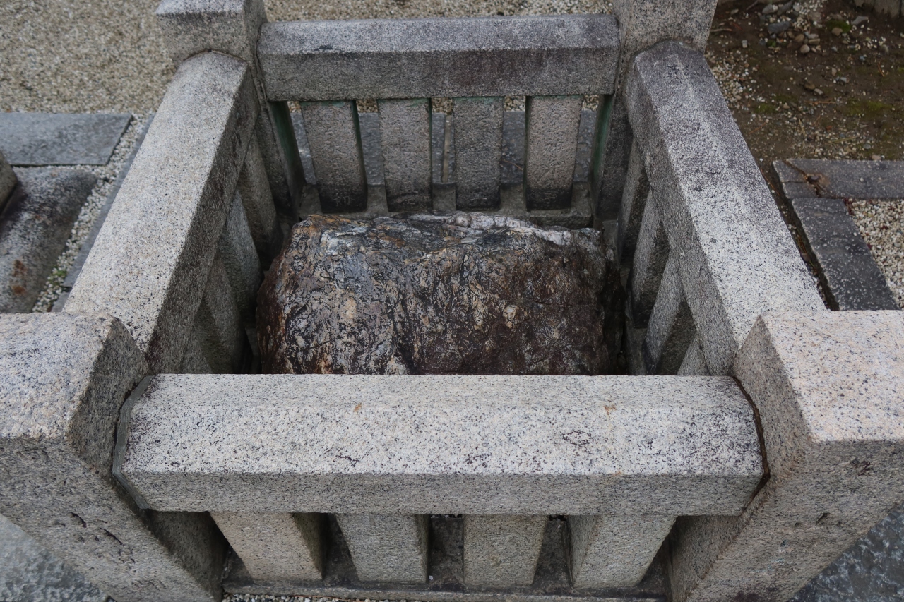 東寺境内の北東部にある毘沙門堂の右手に石塔等が並んで立てられています。その中で石柵で囲まれた石が天降石です。古くからこの地にあった石で、天降石を撫でた手で体の悪い所を撫でると治ると言う云われから撫で石ともいわれている御利益のある石です。