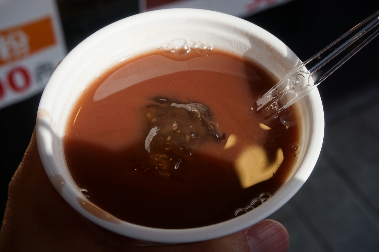 大谷堂は、川崎大師の門前商店街のなかほど。わらび餅が名物のお店です。いただいたのは、わらび餅のお汁粉。こんなの初めてですけど、どうなんでしょうね。うーん。このお汁粉の甘さがなかなか。甘ったるいけど、それが思うほどくどくない。ギリギリの線を行っていますね。こうなってくるとわらび餅は脇役かな。でもそれでいっこうに問題なし。センスのあるお汁粉だと思います。