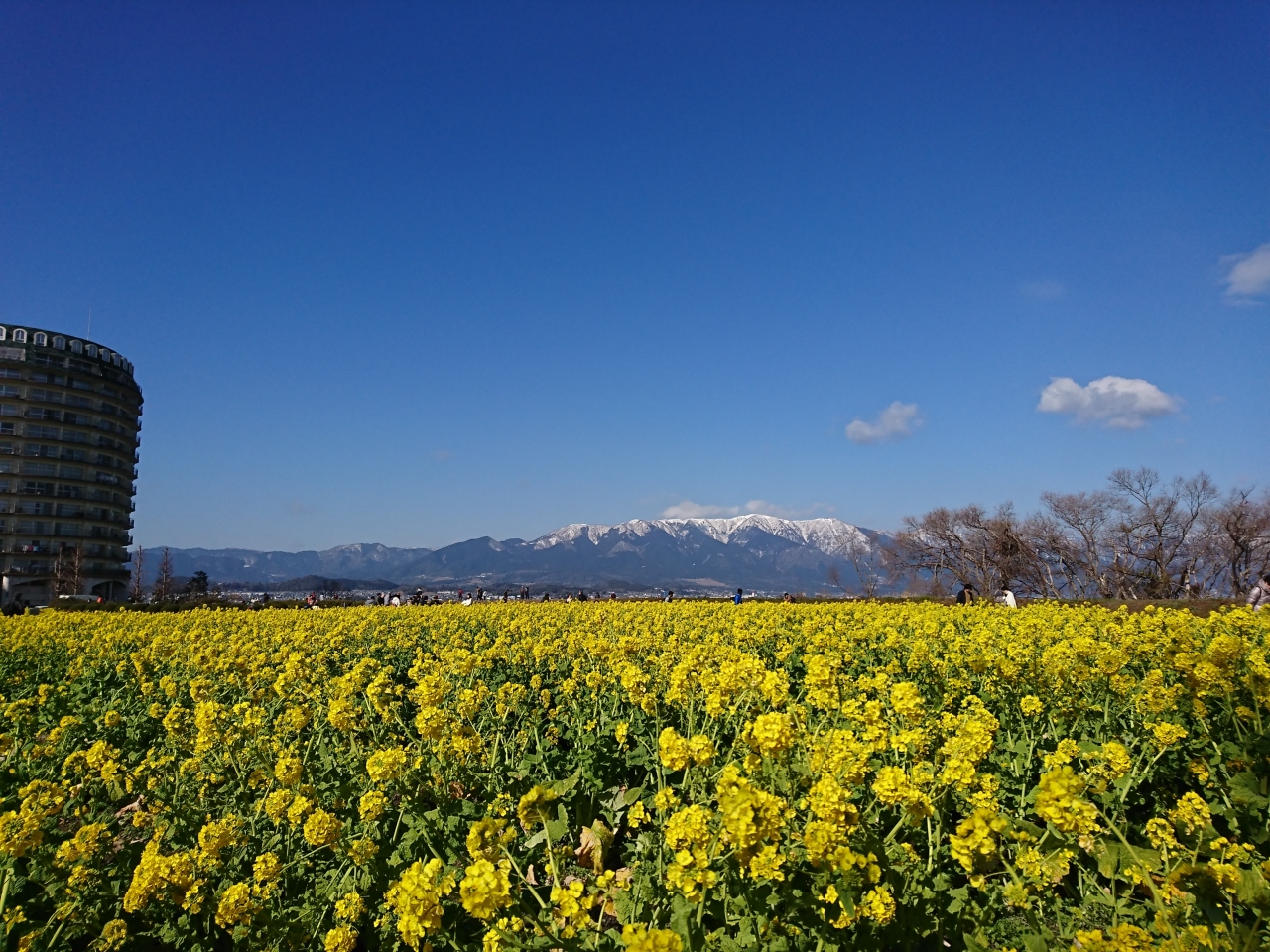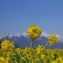 黄色い菜の花が青空に映えて、雪山とのコントラストもとても綺麗で絶景でした。