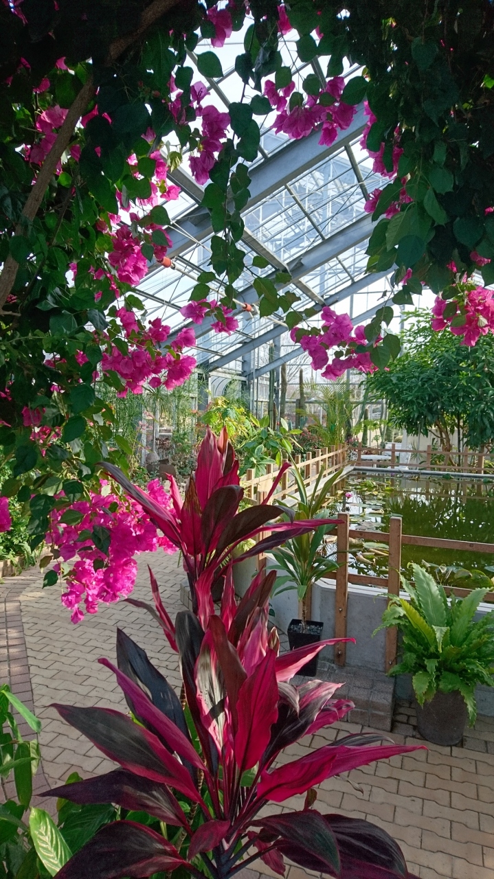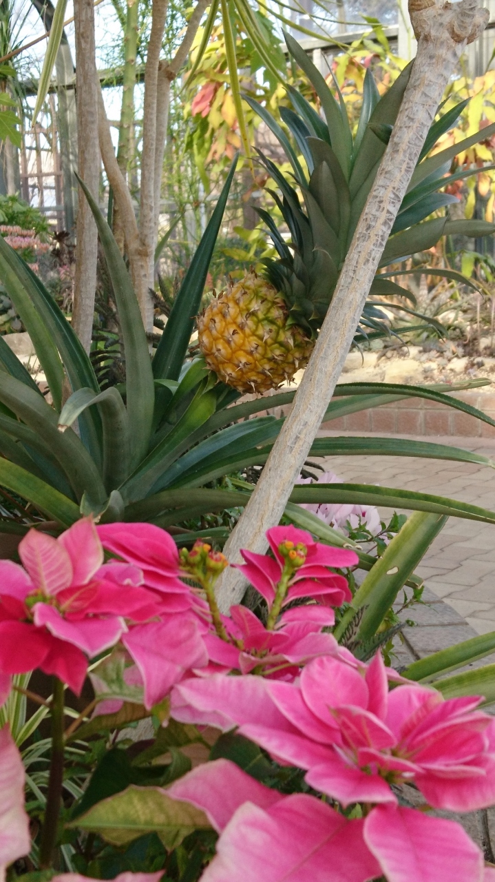 ブーゲンビリア、サボテン、極楽鳥花、パイナップルなど熱帯系のものがたくさんあります。温室内部に小さな池もあり、そこにも水草がお花を咲かせていました。