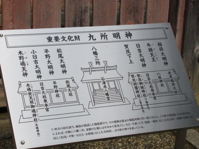 この「九所明神」は仁和寺の伽藍を守る社で、本殿・左殿・右殿の三棟から構成されています。八幡三神(国宝である石清水八幡宮)を本殿に、左殿(東側)には賀茂上下・日吉・武答・稲荷を、右殿(西側)には松尾・平野・小日吉・木野嶋の計九座の明神を祀っています。