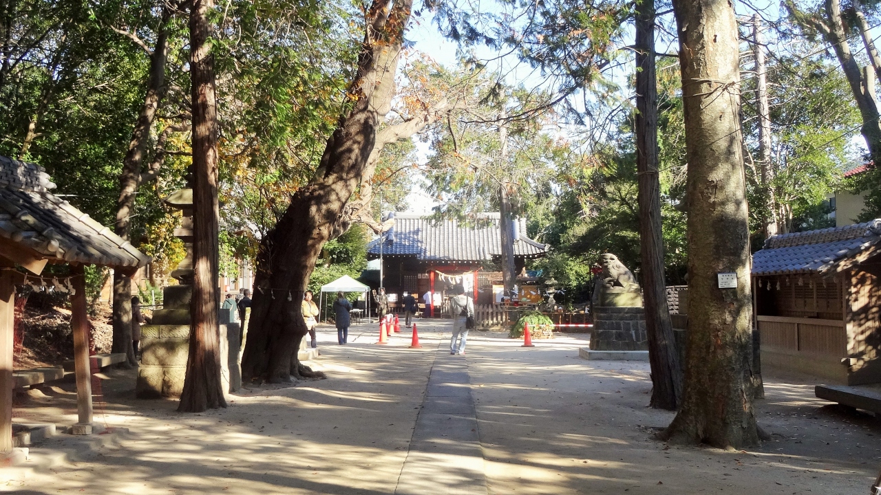 大宮の氷川神社から4km程南東にあります。大宮駅東口から国際興業バス「中川循環」で、最寄りバス停はその名も「中山神社」。20分弱で到着です。境内は左側50m程の場所に二の鳥居と共にありますが、一の鳥居は道を渡った右側100m程の箇所にあります。