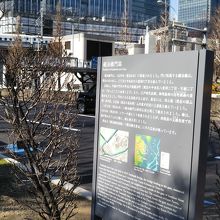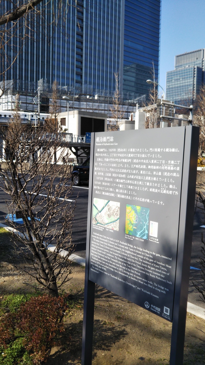 東京駅八重洲口から外堀通りを南へ向かった鍛冶橋交差点に案内板が立っています。其処の記載は鍛冶橋門跡となっています。