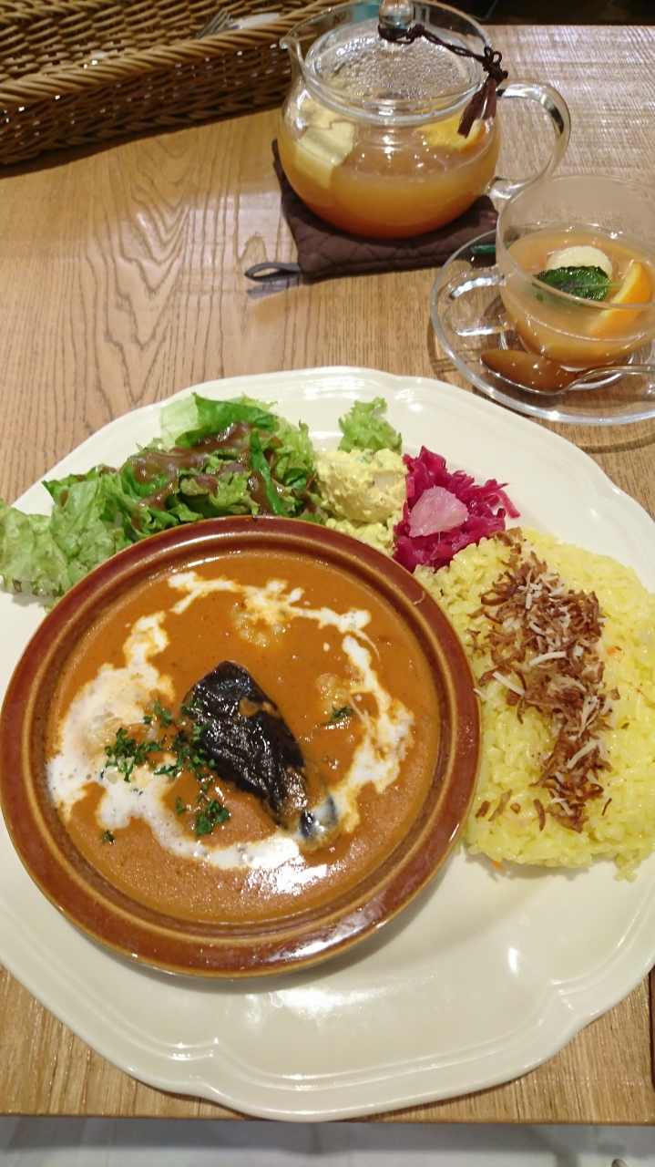 エビとなすのトマトクリームカレーと、スイートフルーツティーをオーダーしました。