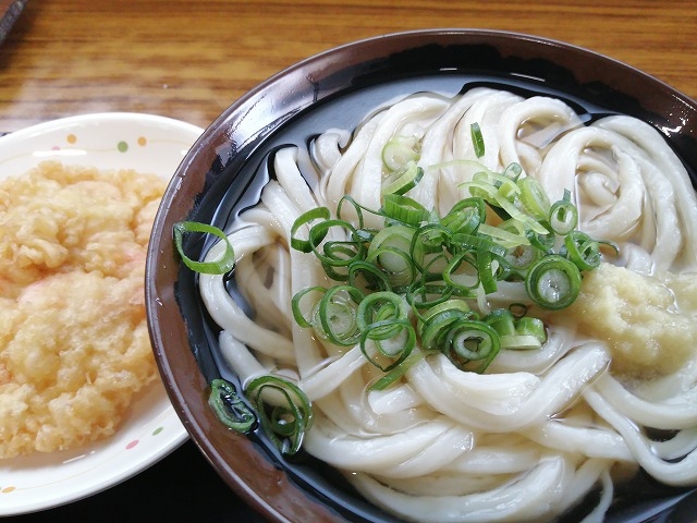 お盆を持って、中(2玉)の冷冷をオーダーして、焼き揚げ風のかき揚げをつけて、400円でした。しょうがを入れると、さっぱり感が増しました。