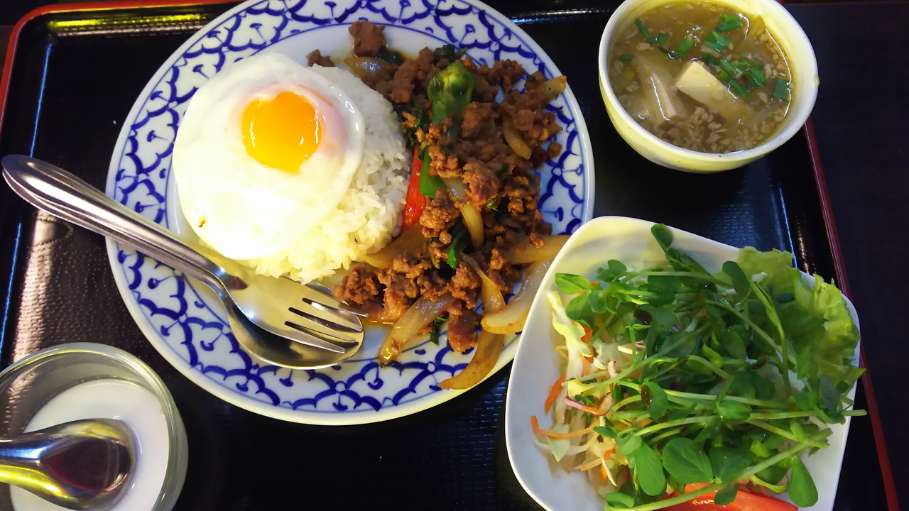 ガパオライスにしましたが、日本人の口に合わせるというよりも本格的なかんじで、辛さもけっこうありましたし、香り付けもつよめでした。タイ料理の日本のチェーンにくらべるとより本場に近いと思います。卵は半熟でおいしく、挽き肉も粗びきでとても美味しかったです。