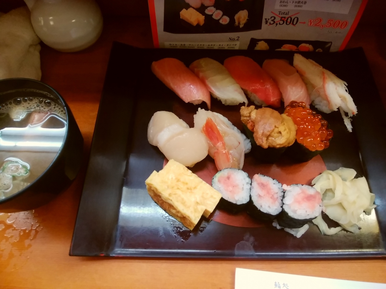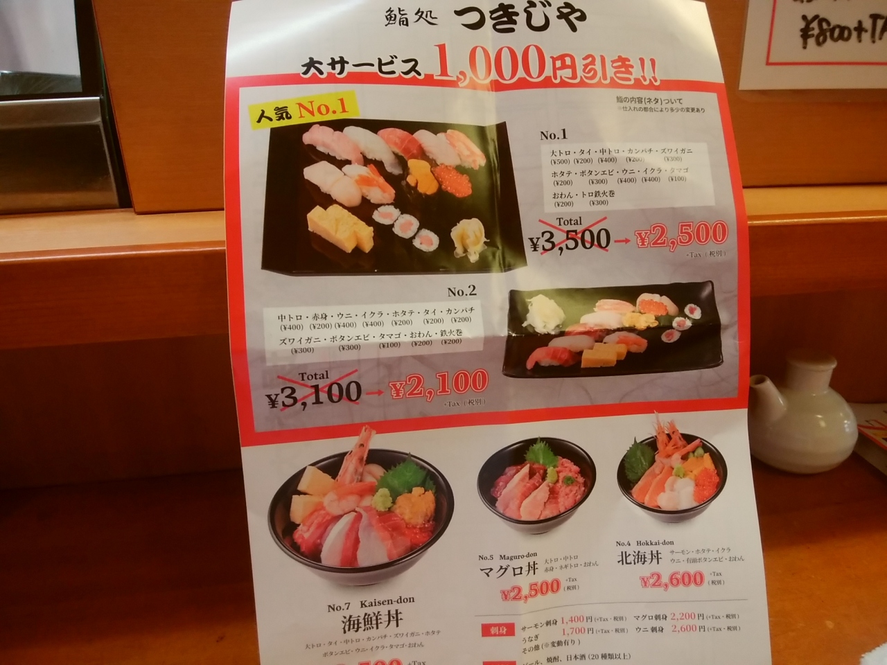 友人と築地場外を散策して、昼食はちょっと外れにあった鮨処 つきじやに入りました。入口の看板に、3500円が2500円に1000円引きについひかれちゃいました。2500円のお寿司は、新鮮で脂がのったネタでとても美味しかったです。大トロ、中トロと入っていてついお得感を感じちゃいました。