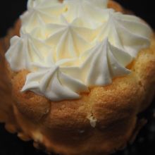 洋ナシのババロアを、王冠の様に丸めたスポンジケーキで包んでいる。