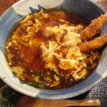 エビフライがのった玉子とじのおうどんも美味しそうでした。ゆったりと食事できる雰囲気も気に入っています。
