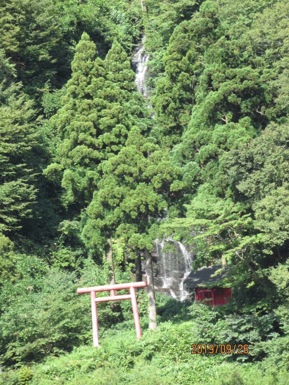 赤い鳥居の奥に見える白糸の滝は白く輝きを放って夏の日に映えます。
