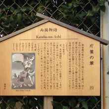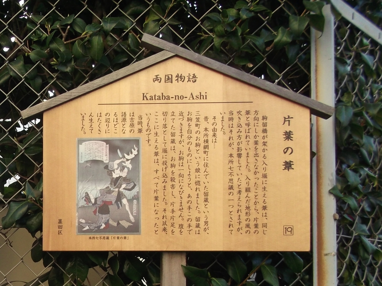 両国駅側の両国橋のたもと近くに、この案内板が立っていました。このあたりに生える葦は同じ方向にしか葉を出さなかったことから片葉の葦と呼ばれ、本所七不思議の一つだったそうです。その由来は恐ろしい怪談話があるようですが、当時はこのあたりには葦がうっそうと生えていたことを今に伝えています。