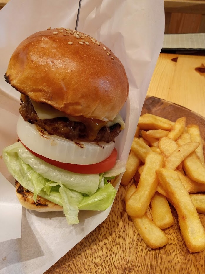 神保町駅から5分ほど。週末のランチで利用しました。オフィス街なので週末のランチタイムはガラガラ。すぐに席につけました。ハンバーガー、フライドポテト、ドリンクで1300円ほど。ハンバーガーは肉厚でジューシーで食べ応えがあります。