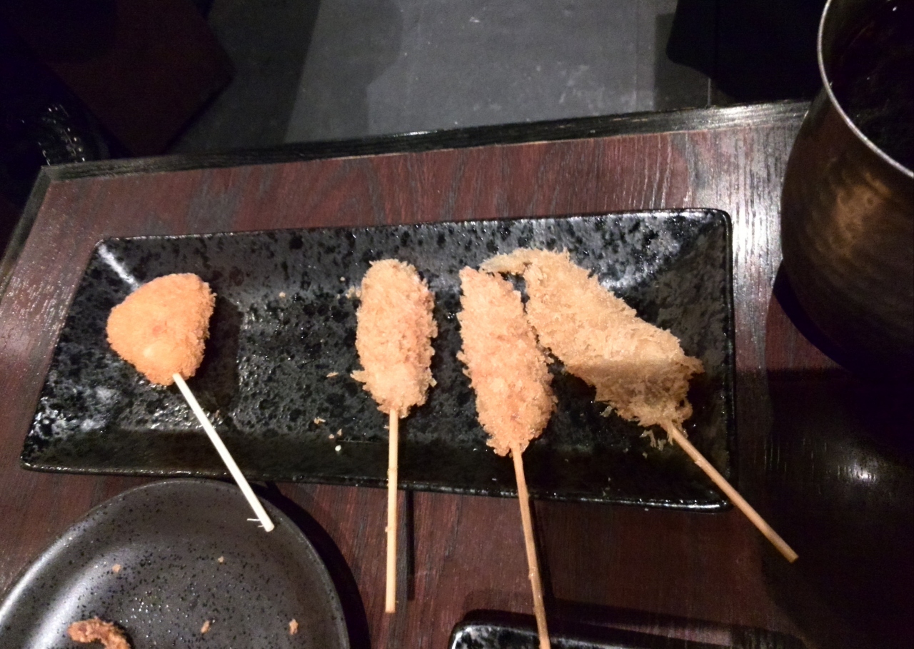 当日2軒目に行ったお店です。串カツが割と安価だったので、利用してみましたが、サイズが小さく、少し物足りない気持ちになりました。単品のゲソのから揚げなどは美味でした。喫煙者が多かったこともあり、非喫煙者にはいまいちでした・・・でも、ビールのメガサイズなどもあり、喫煙する男性にはいいかもしれません。