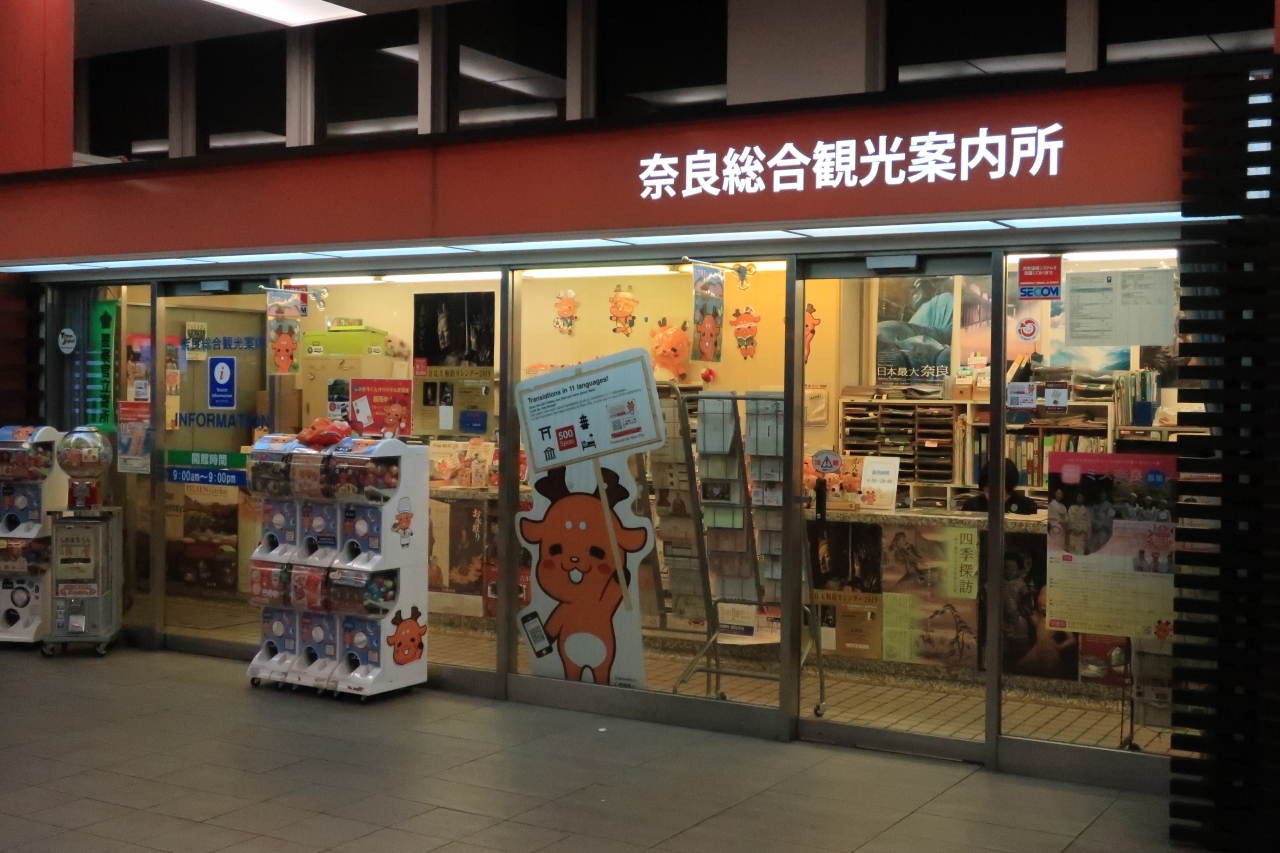 近鉄奈良駅ビルの一階にある観光案内所だ。周辺は奈良市の繁華街だけに、午後9時まで開いているのがうれしい。英語で対応可能なスタッフが常駐しており、外国人観光客に観光案内を提供しているという。奈良市観光協会のキャラクター「しかまろくん」が目印代わりに置いてある。