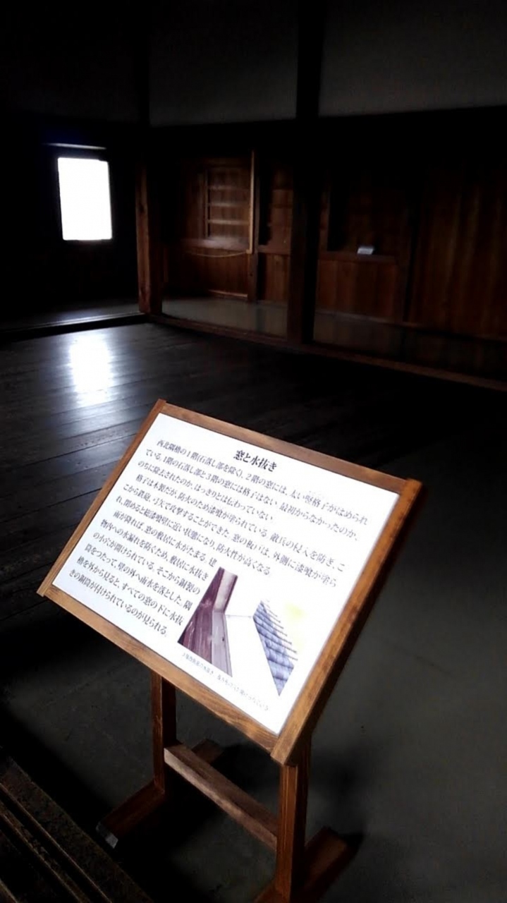 重要文化財である西北隅櫓(戌亥隅櫓)は名古屋城の北西エリア、御深井丸(おふけまる)と呼ばれる場所に現存していました。大人気の本丸御殿からは少し距離があるため、観光客の姿は少なかったです。屋根三重・内部三階の大きな櫓で清須城から移築した建材を使って作った櫓だそうです。普段は内部を公開していないそうですが1月14日に行った時には中に入ることができました。内部では門の上の櫓から下の門扉のところへ向けて石などを落とす『落狭間』を見学することができました。