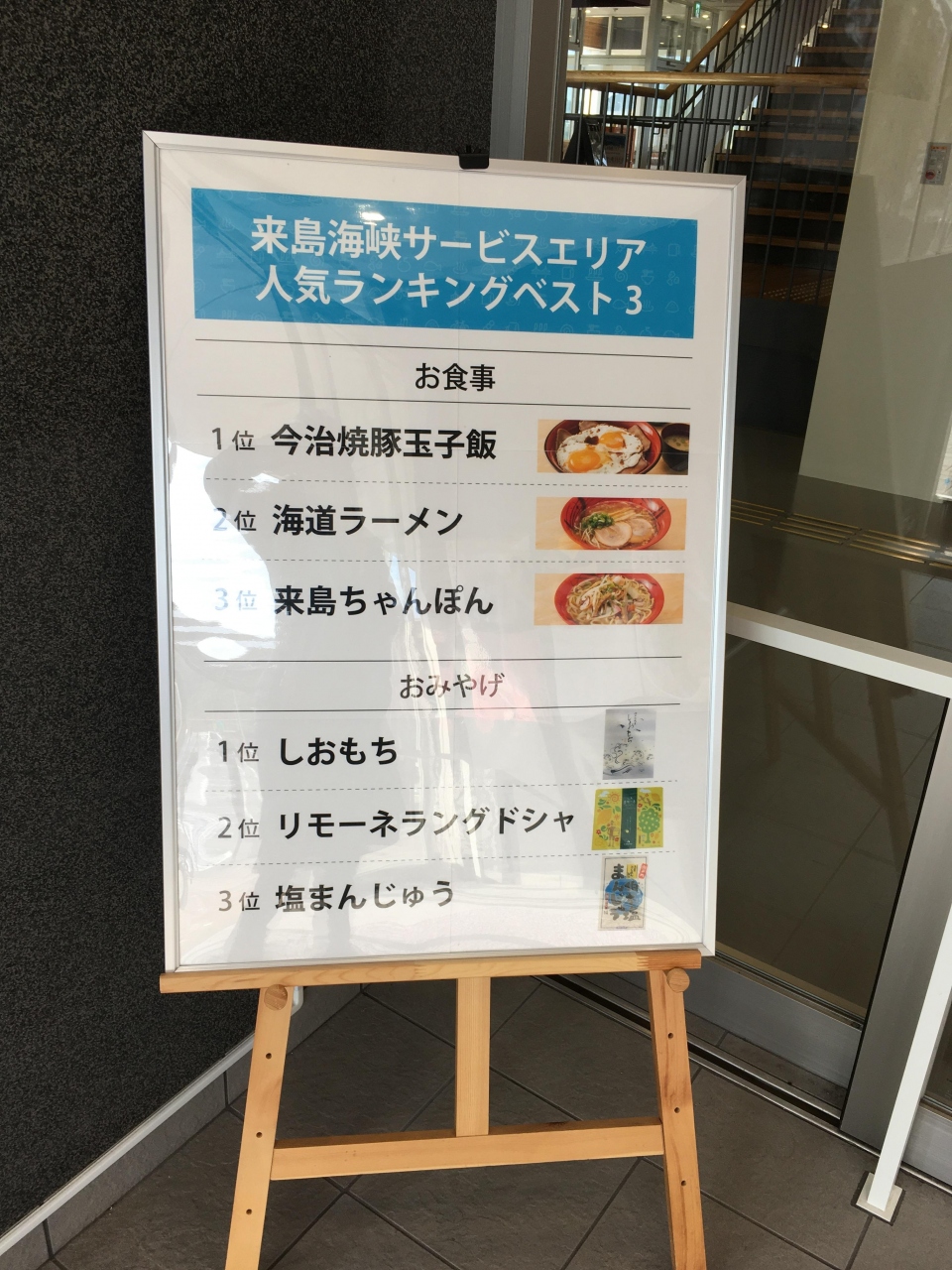 大きなガラスの向こうにある来島海峡大橋の絶景を眺めながら、食事ができます。入り口で食券を買ってから、注文します。よくある一般のSAよりはるかに広くて綺麗です。一番人気は焼豚玉子飯、2位はラーメンだそうです。