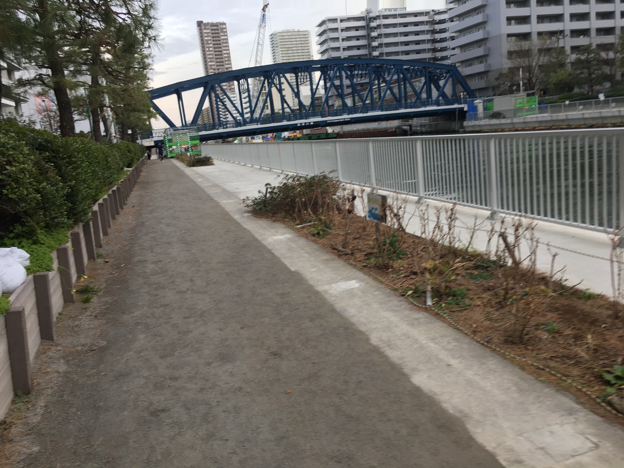 小名木川に架かる鉄橋で、関東大震災後の1930年に竣工された鋼鉄製トラス橋です。鉄柱はペパーミントブルーに塗られ、車道は往復2車線に対して広い歩道を両側に設置されていますので、歩いて渡りやすいです。橋の北側のたもとには「幸福の魚」という巨大なシーラカンスの茶色のオブジェがありました。