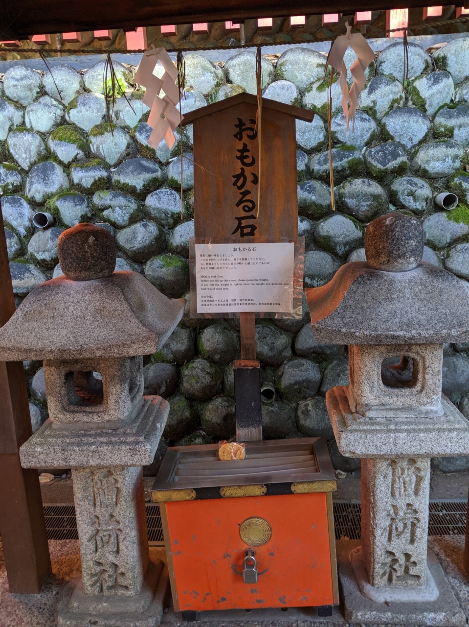 まずはお願いごとをします。そのあと石燈籠に乗った丸石が重いか軽いかを予想し、持ち上げてみます。その石が予想より軽いと感じれば願い事が叶うそう。残念ながら私は想像よりも重く、まだまだ叶えるには努力が足りないのかも!?