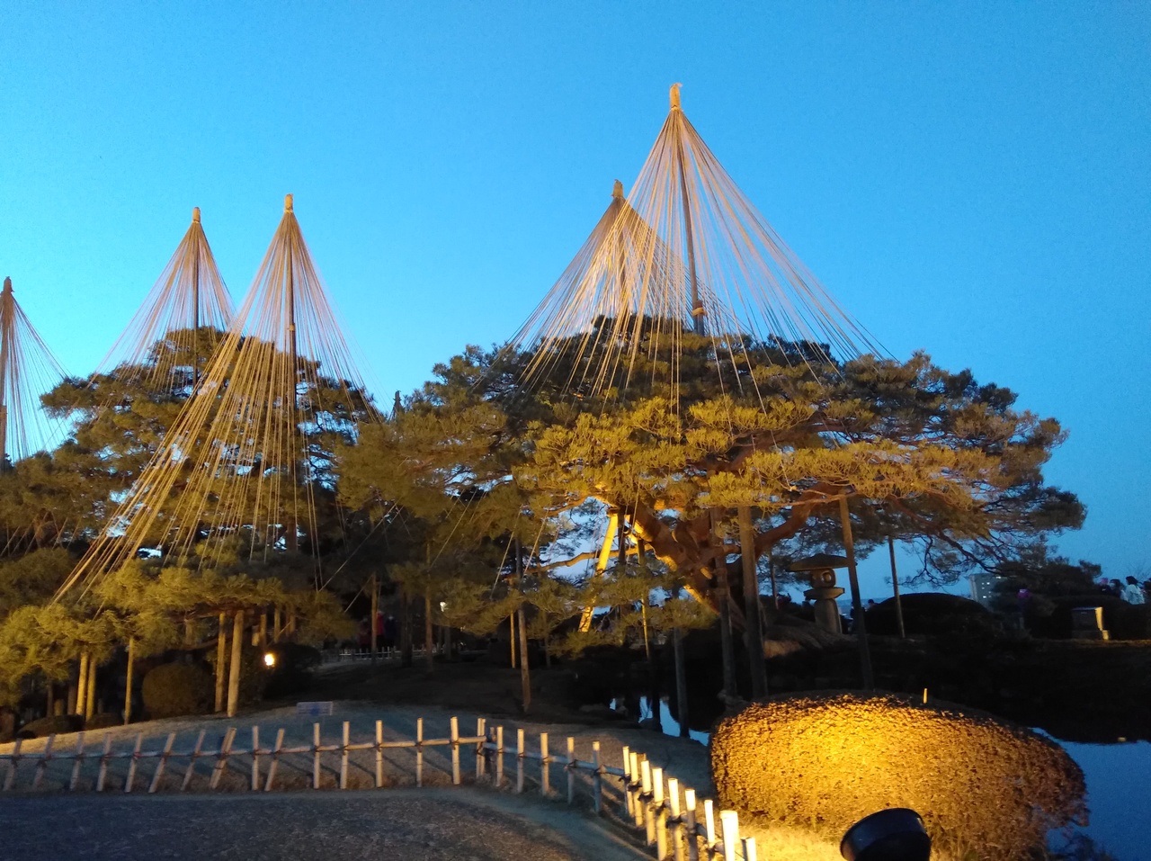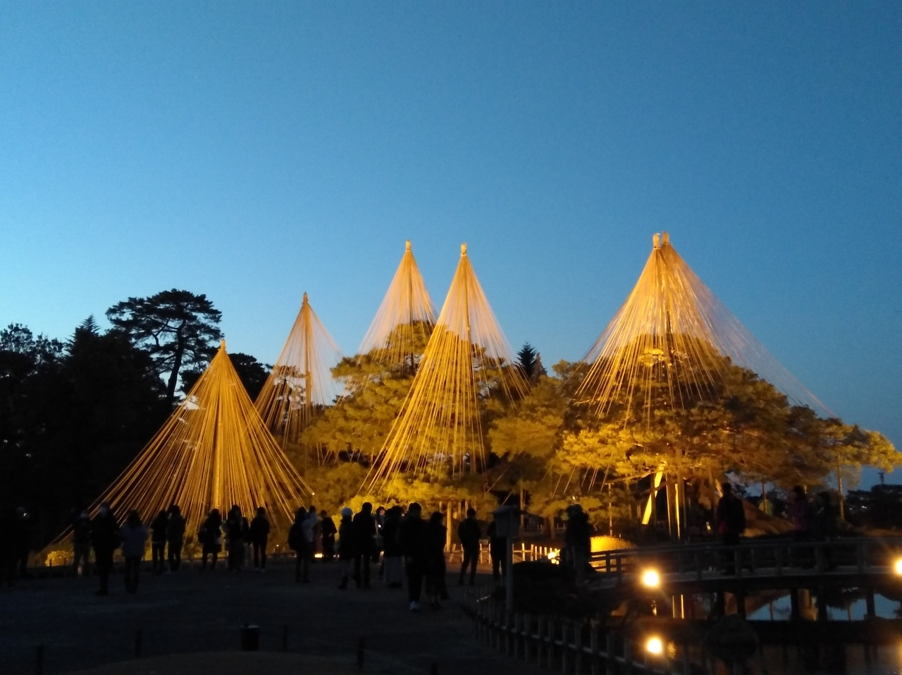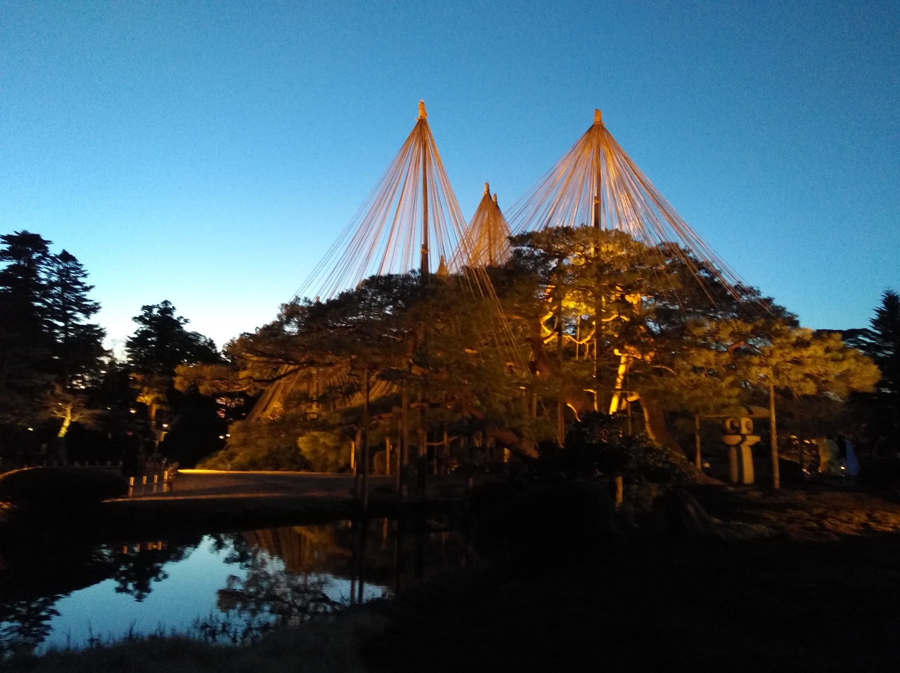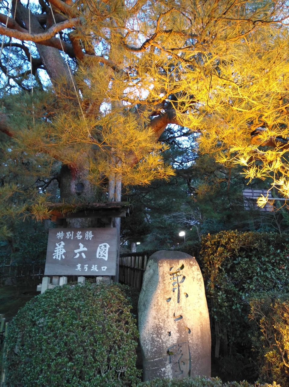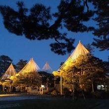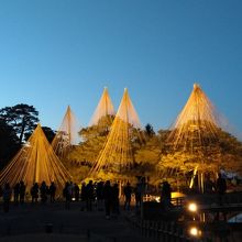 初めての兼六園ですが、運良くライトアップの期間中。前日に降った雪が所々うっすら残る程度で暖かい快晴の夕方。5時半のライトアップ開始時間を待ち真弓坂口から入場しました。無料なのも嬉しいです。団体旅行客も少なく休日ですが混雑もなく素晴しい景色を満喫できました。夕暮れから日没後の景色の変化も見る事ができ最高でした。