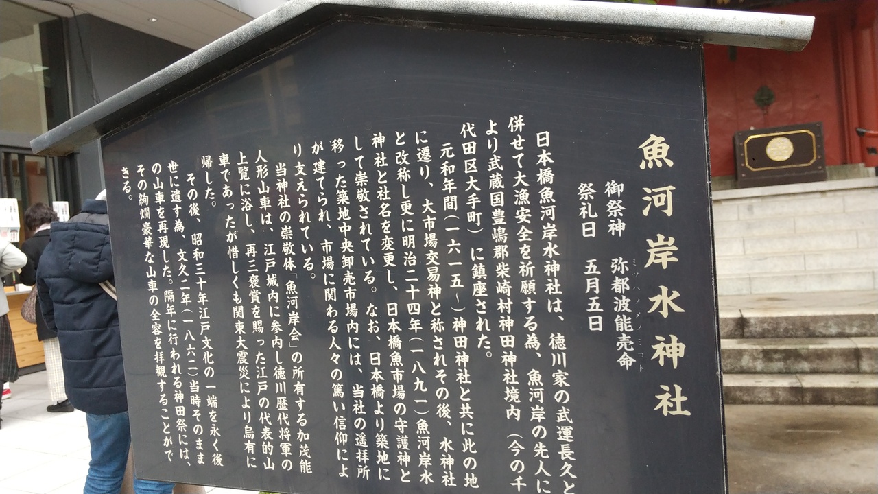 御茶ノ水駅から歩いて約10分,神田明神には小さなお寺や神社がたくさんあり,歴史を伝える案内板も立っています。魚川岸水神社は,徳川家の武運長久と大漁暗線を祈願するために鎮座された神社だということです。しっかりお参りしてきました。