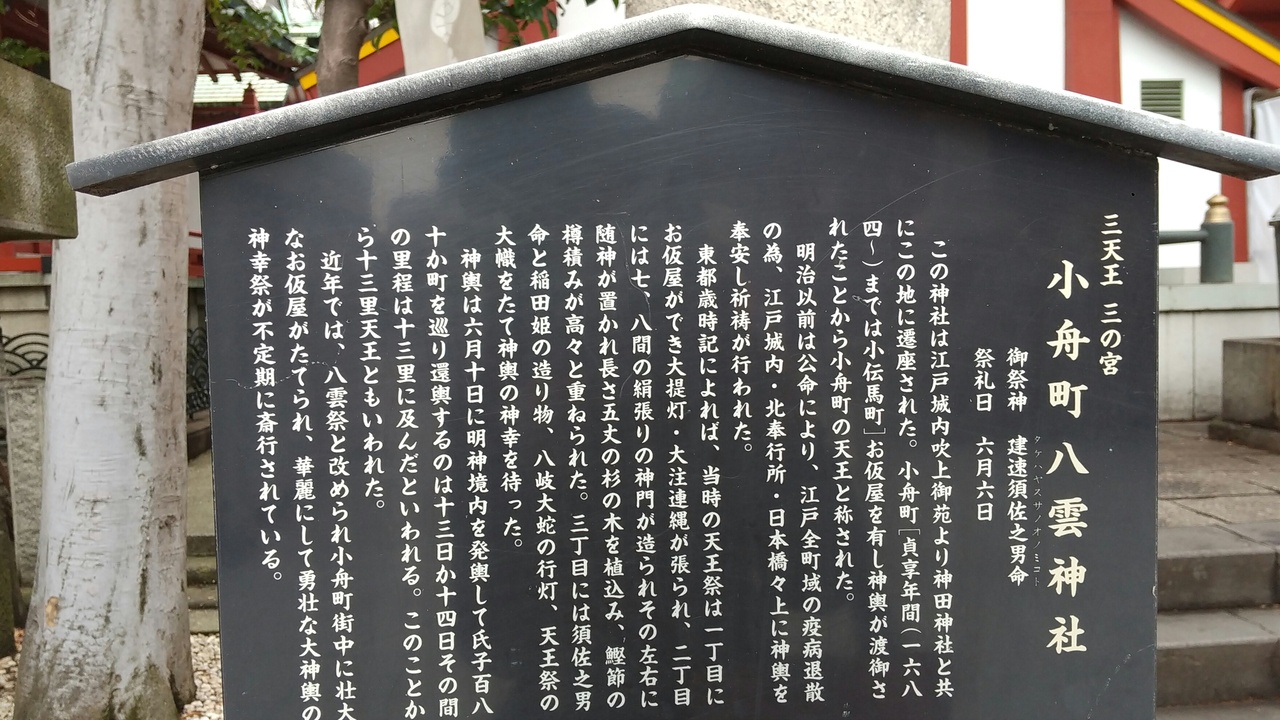 御茶ノ水駅から歩いて約10分,神田明神には小さなお寺や神社がたくさんあります。その一つである小舟町八雲神社は,江戸時代に江戸城から遷座されたとのこと。案内板で歴史と由来を学んで,しっかりお参りしてきました。