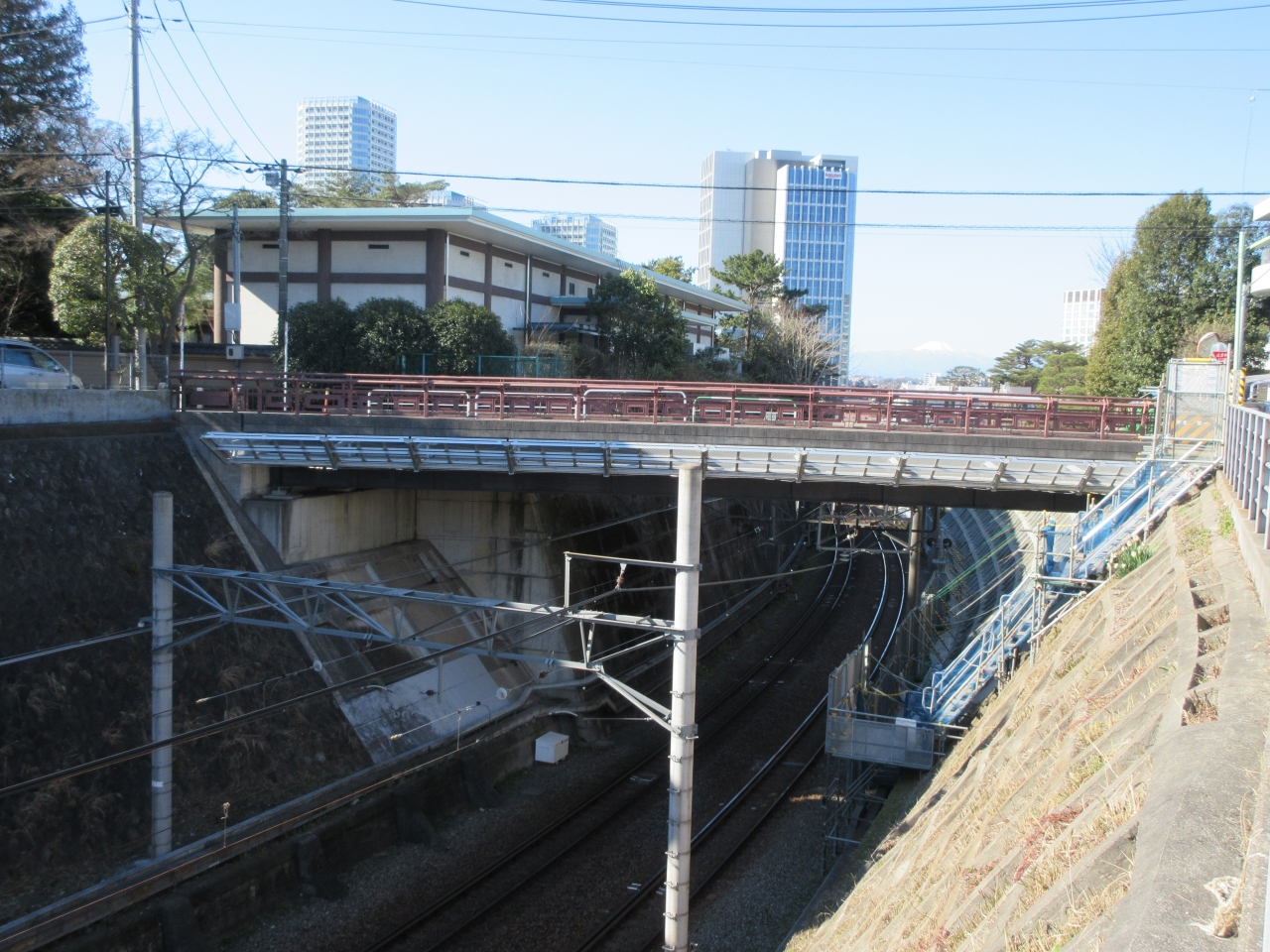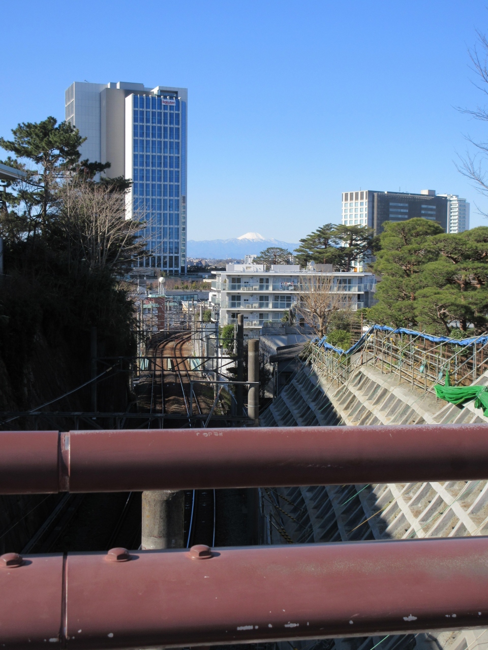 東急大井町線・上野毛駅から5分ほど、大井町線に架かっている橋です。東京にはいろいろな場所に富士見と名が付く場所がありますが、多くは周辺にビルなどが建ち富士山は見えなくなってしまっています。ここも同様かと思い訪れましたが、橋の上からは雪をかぶった富士山がきれいにくっきりと見え、富士見という名にふさわしい橋でした。橋から1分ほどのところに建つ五島美術館を訪れた際に渡ってみてください。