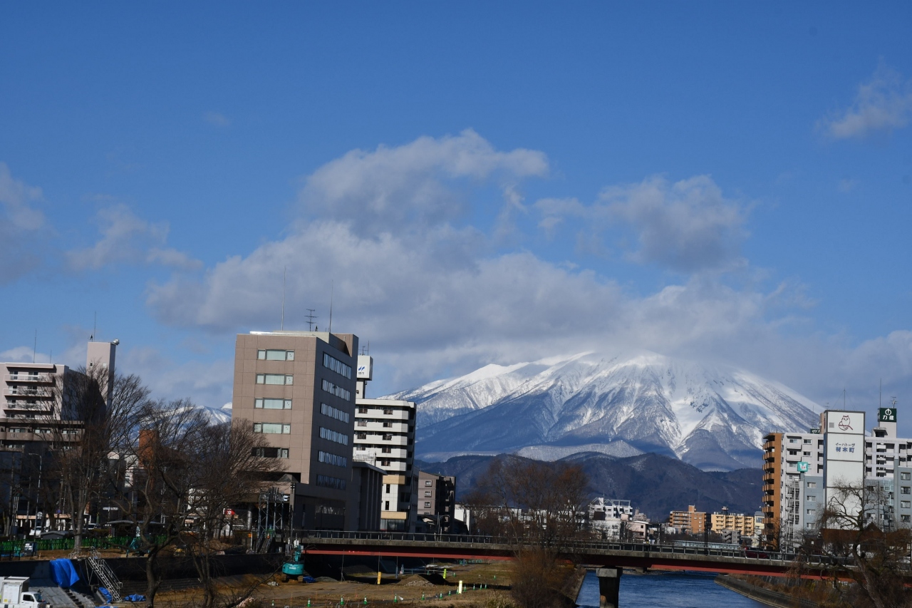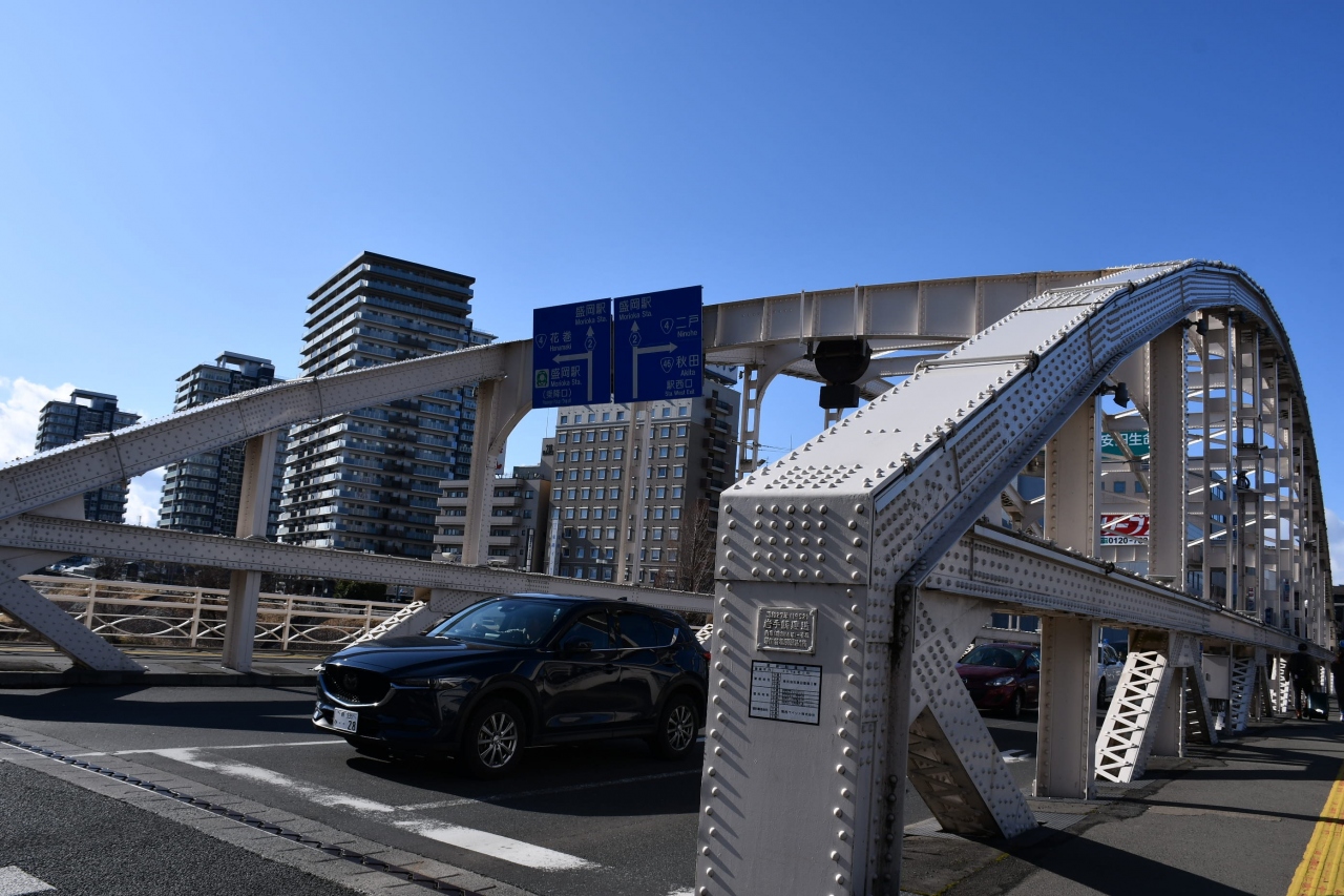 盛岡駅東口を出て、大通りを進むと北上川に架かる古風な橋が見えてきます。小さな橋ですが、風情があります。中程からは、岩手山が見えます。遮る物がないので、天気が良ければ絶景です。この橋から城跡に続く一帯が、市内の繁華街のようです。