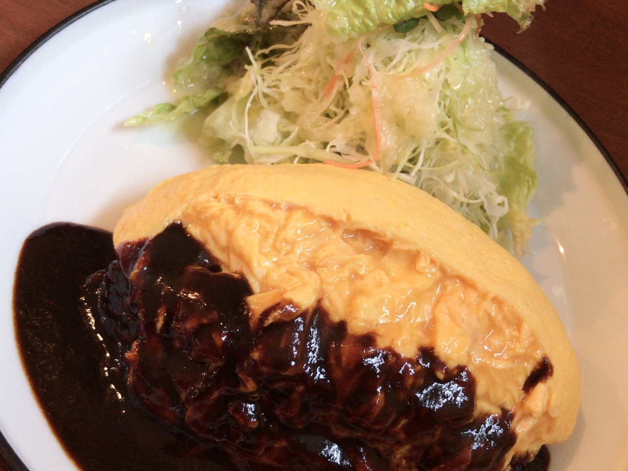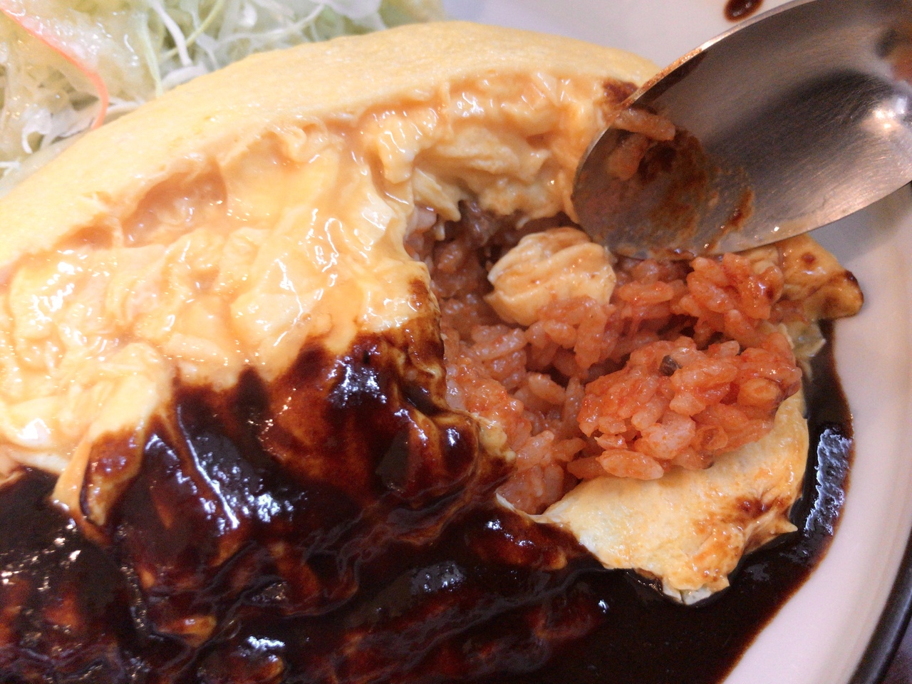 ケチャップライスの上にはふわとろオムレツ。更に上にかけられたドミグラスソースがまたいい。ほんのりと苦味と酸味があって、ちょっぴり大人の味に仕上がっています。
